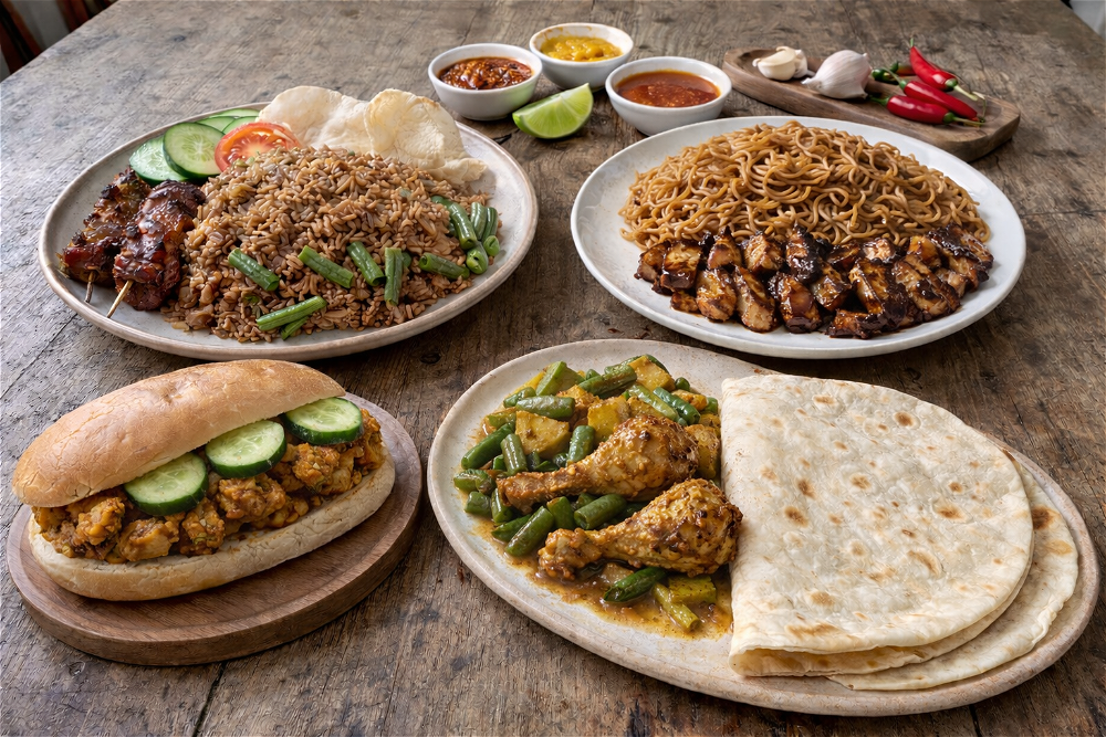 Roti met kipfilet ketjap, aardappelen in kerrie en kousenband.